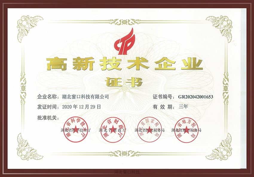 2020年12月29日,湖北窗口科技有限公司再次榮獲由湖北省科學技術(shù)廳、湖北省財政廳、湖北省國家稅務(wù)局、湖北省地方稅務(wù)局聯(lián)合頒發(fā)的《高新技術(shù)企業(yè)》證書。《高新技術(shù)企業(yè)》的成功獲批,是對公司實力的高度認可,也是對公司引領(lǐng)行業(yè)前沿的持續(xù)鼓勵。